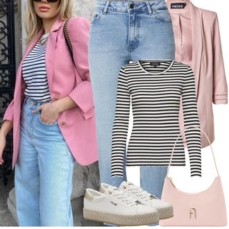 Outfit s Fialová/Hnědá/Černá/Bílá/Tmavě modrá Pruhované Tričko SELECTED FEMME/Selected "Jarní Outfit"
