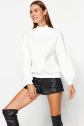 TrendyolBlack Thick Polar Fleece Oversize Crop Sleeve Printed Knitted Sweatshirt
